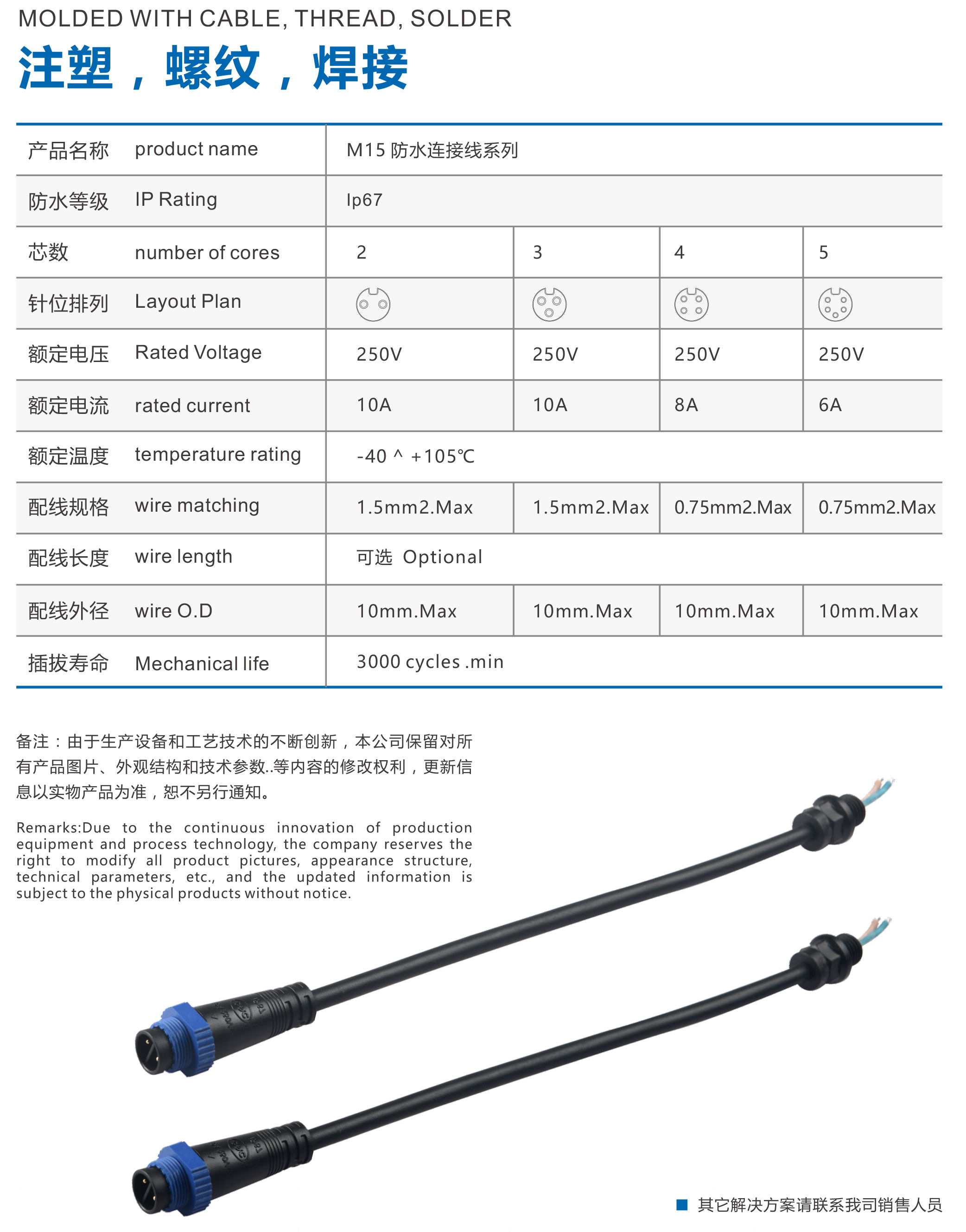 TAWANG以“科技創新,優質高效,顧客至上,持續改進”的質量方針,關注顧客需要,滿足顧客要求,不斷追求新的發展。在質量管製方麵,建立以製程管控為基礎,預防為主的質量管控模式。滿足不同行業、不同應用、不同需求的使用者要求,成為電子、通訊及高科技企業的理想合作夥伴,永遠是TAWANG孜孜以求的目標和不斷超越的動力源泉!這一款M15 直頭螺紋式公母頭係列芯數有2-5芯可選,滿足客戶多種需求!TAWANG M15 直頭螺紋式公母頭係列廣泛用於戶外防水工程,LED路燈,隨道燈,地鐵、橋梁,城市亮化照明工程,家電,噯風機,電暖器,等家電,電動工具,戶外LED燈,戶外燈具,水泵,地埋燈,水低照明等。橡膠線較軟,彈性好,耐高溫,耐油,耐寒,承受外力強度高,具有很高的耐候性,尤其適合於戶外工程,接觸油汙或環境惡劣的場所,壽命長,耐老化。TAWANG的M15 直頭螺紋式公母頭係列具有耐寒、耐高溫、防水、易安裝、接觸性好,性價比高等優點。TAWANG的M15 直頭螺紋式公母頭係列安全可靠、質量保障!2-3芯線已經獲得UL、TUV、CQC的認證!TAWANG歡迎您的谘詢~